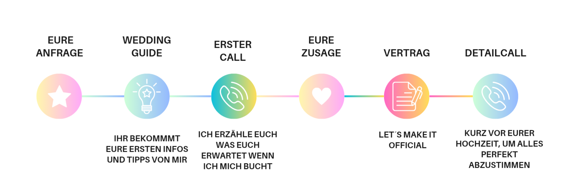 Meinen Wedding Guide schicke ich euch wenige Tage nach Erhalt eurer Anfrage per Mail zu. Wenn euch mein Angebot zusagt, suchen wir einen Termin für einen ersten Videocall. Hierbei können wir uns kennen lernen und erste Eckpunkte eurer Hochzeit und eure Wünsche an mich als Hochzeitsfotografin feststecken.
